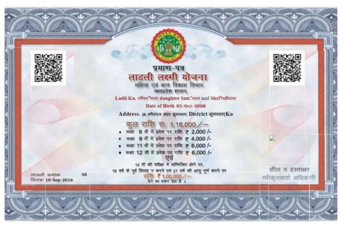 बेटियों को 1,18,000 रूपए की आर्थिक सहायता एमपी सरकार द्वारा दी जा रही है। लाडली लक्ष्मी योजना प्रमाण-पत्र के तहत बालिकाओं की शिक्षा में सुधार होगा, एवं बेटियों को भविष्य उज्जवल भी होगा। इस योजना के संचालन से लड़का-लड़की में होने वाले भेदभाव को समाप्त किया जा सकेगा एवं बाल विवाह एवं भ्रूर्ण हत्या जैसे अपराधों पर लगाम लगेगी।